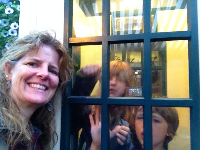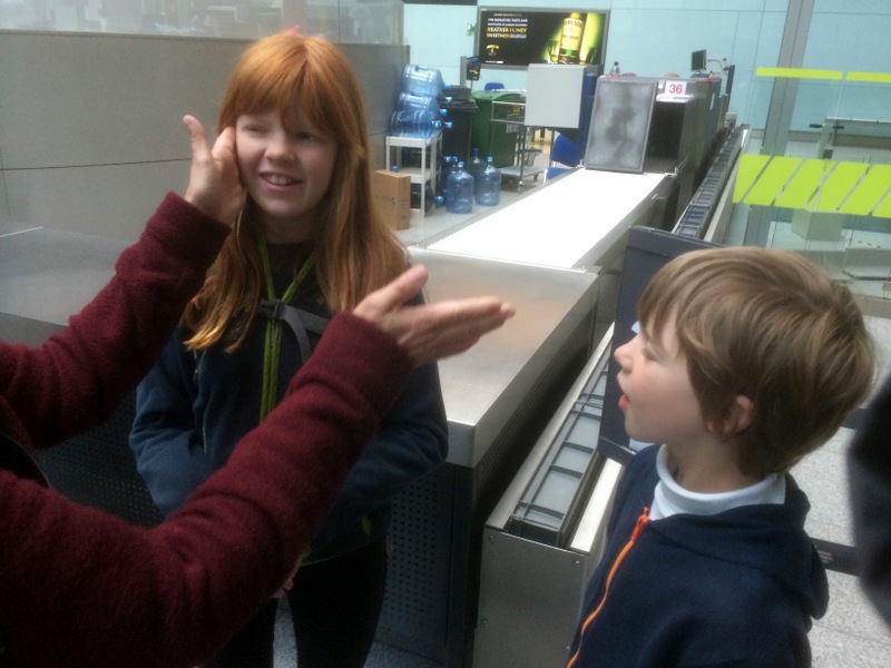 And then it was back to the airport! In the security line, Alison taught the kids how to stage fight by pretending to slap your partner. Vernon took this picture with his iPhone, so we violated the no-fighting, no-cameras and no-cell-phone rules all at once!