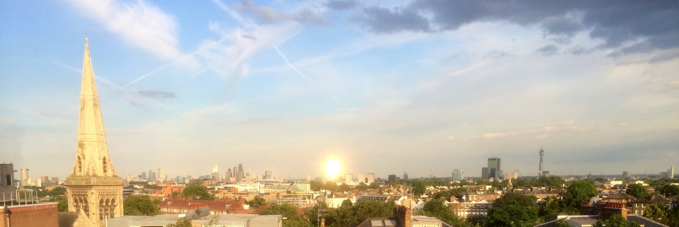 View from our flat at sunset. That's the Shard blindingly reflecting the setting sun. On the far right of the picture you can make out the outline of the London Eye Ferris wheel.