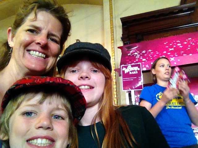 When we bought the tickets the options were orchestra or seats in a box. On a hunch we went for the box seats, and it turned out to be a classic box seat on stage left with exactly four chairs in it (not fixed seats). It was a real treat - plus the show was fantastic. At the curtain call, Mr. Wonka slips off stage and appears in the box just below us and slightly closer to stage, so for a second Cielo and Eero though Charlie was waving up to them!