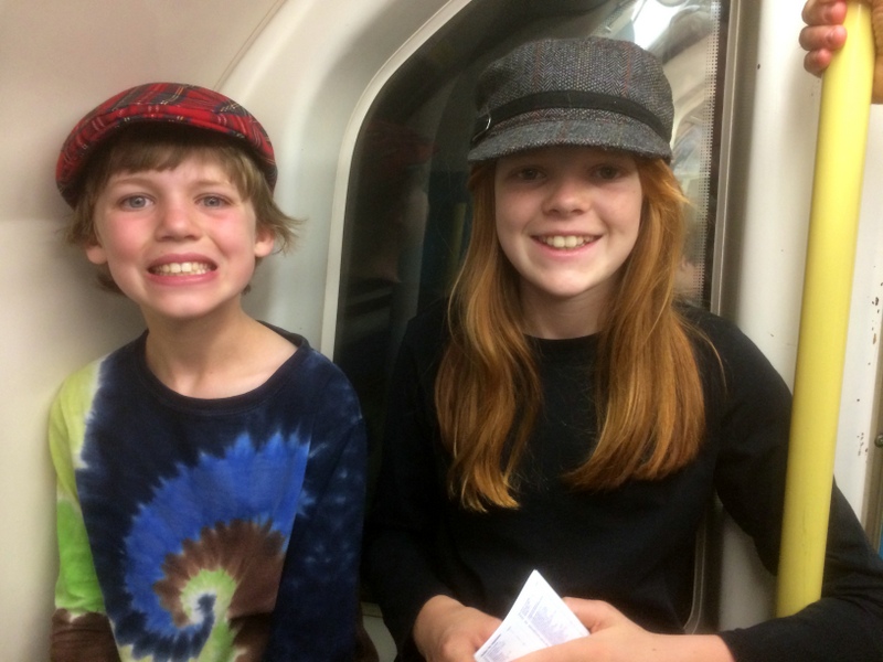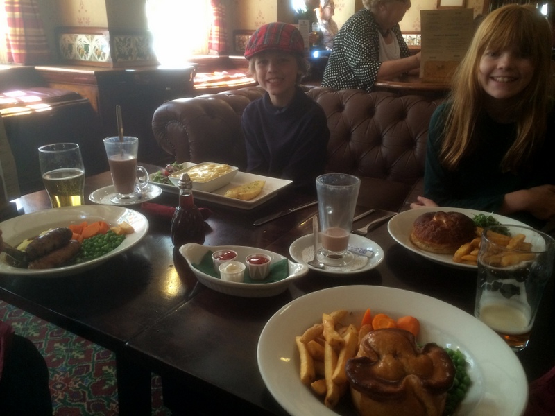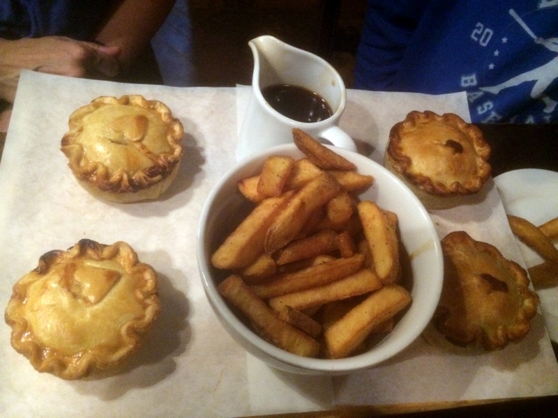 Lots of good food in London. This was after the Charlie and the Chocolate Factory show - two kinds of pies, bangers and mash, and Eero had the mac and cheese.