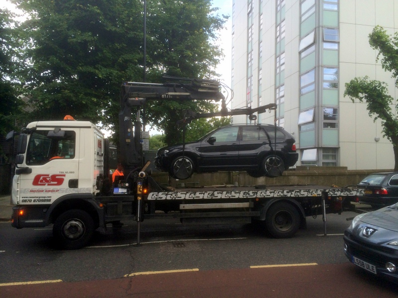 Driving would have had its own problems, anyway. This car is being towed by lifting straight up from where it was parked and then lowering it down onto the truck bed. We were standing there staring and taking pictures - hopefully the car owner wasn't watching.