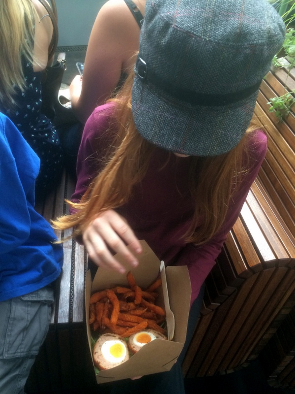 Borough Market there are a ton of food stalls. Cielo picked out this Scotch egg and best sweet potato fries ever. Not pictured: Vernon's pork sandwich cooked on a spit and carved off the pig at the market.
