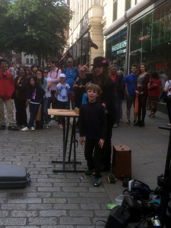 After Charlie and the Chocolate Factory, we came across this street magician while walking through Covent Garden. He was doing a balls-and-cups trick and invited Eero to come over and help verify that the correct number of balls and of cups were in play. He also held the cups up to his chest and asked Eero what they were now. After Eero whispered his answer, the magician stood up and said "You cheeky boy! They're not boobs, they're cups!"
