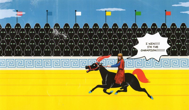 At the British Museum, in the basement, there's a kids' activity area. The day we were there you could put yourself into the ancient Greek Olympics. Cielo chose to be a jockey and filled in the speech balloon herself.