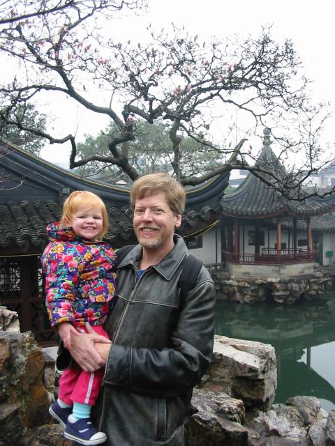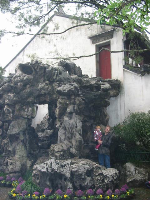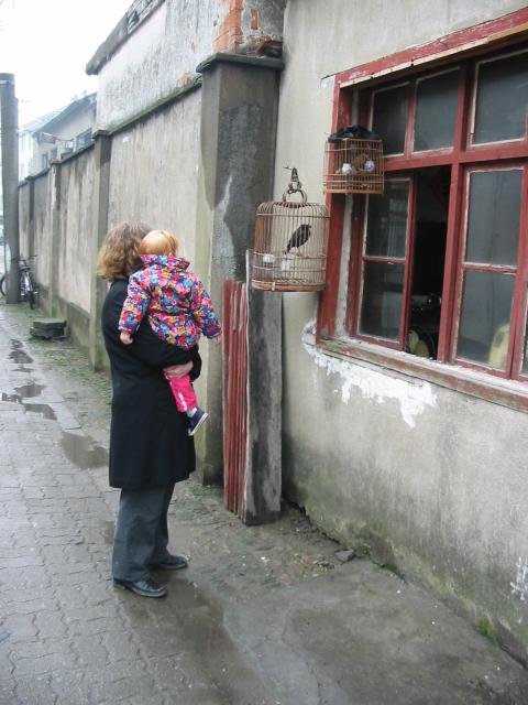 The "alleys" of Shanghai and Su Zhou are the place you want to walk around. There are few cars, and they're generally very pretty. Here are Alison and Cielo saying hi to a couple of pet birds near the Master of Nets Garden (Wang Shi Yuan).