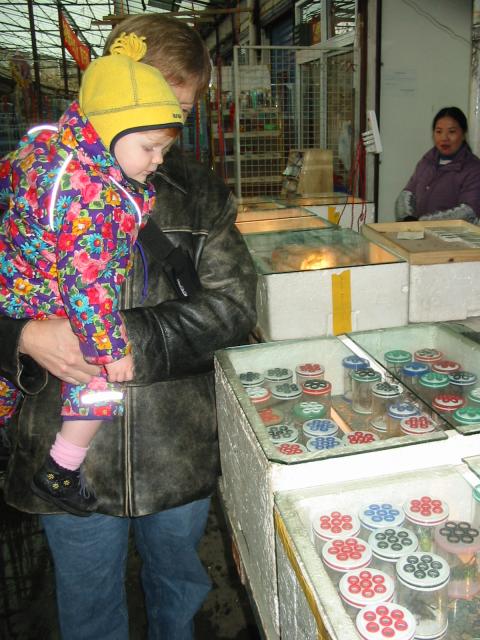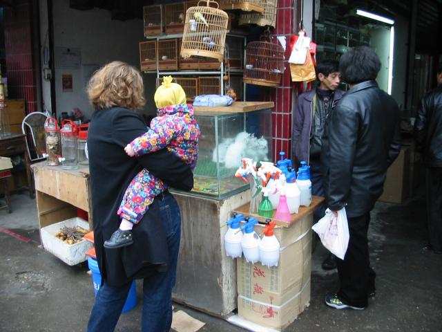 The bird and insect market in Shanghai sells many other things, like fish and kittens. Puppies and kittens and bunnies are generally displayed in big glass aquaria like the one here. Cielo wasn't sure what to make of it.