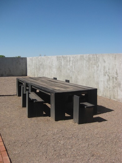 The next section was a large warehouse sized building that Judd converted into a public space. We asked if it was still used and the guide said there had been a big event there just the night before. Here's one of the outdoor tables and Alison sitting at one of the indoor tables.