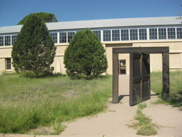 The view from outside the event building - you can see how large it is. The square pivoting doors were a common theme in many buildings at Chinati.