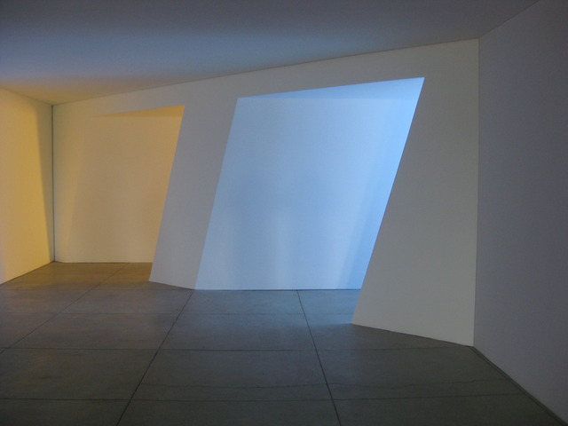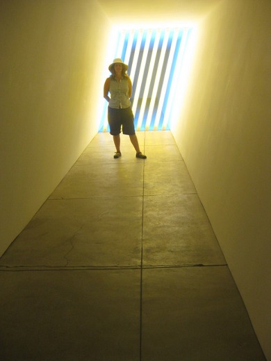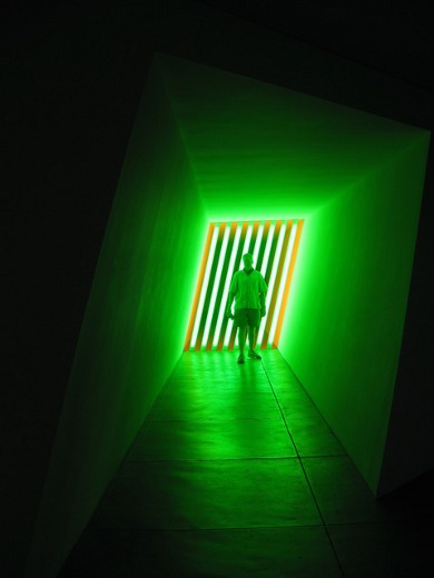 Flavin's piece was a series of former U-shaped Army bunkhouses where he had installed different colored fluorescent lights in the bottom of the "U", behind grids. It was a very Altered States sort of look.